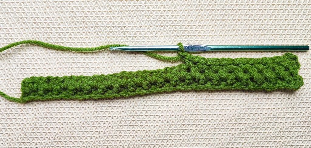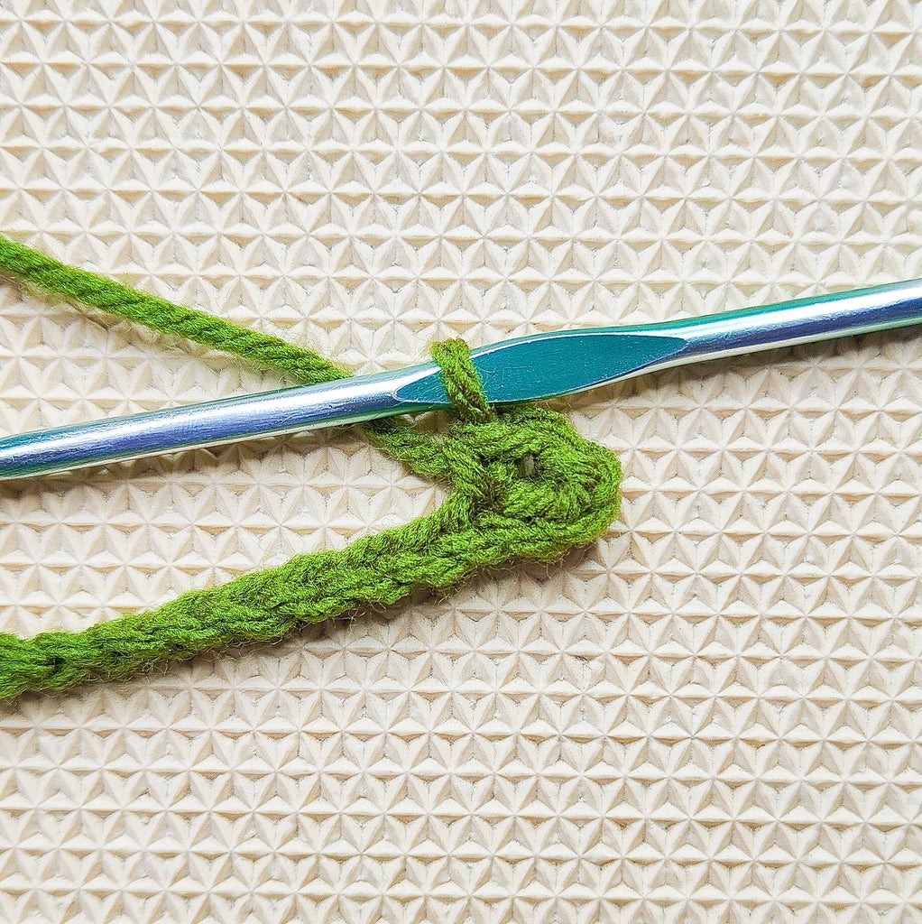 - Giro 1: Fai un punto basso nella quarta maglia dal gancio, fai 1 catenella, salta 1 maglia, fai un punto basso nella maglia successiva, fai 1 catenella e ripeti (1 punto basso, 1 catenella, salta 1 maglia) lungo tutta la catenella. Fai 2 catenelle e gira il lavoro.